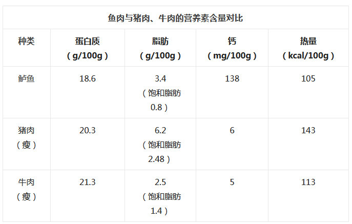 鱼肉作为“白肉”的一种,比起猪牛羊肉来说,热量和饱和脂肪的含量更低,钙等矿物质的含量相对更高,可当作减重、减脂期的优质蛋白质来源。